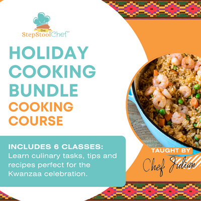The Step Stool Chef Kwanzaa Special is the perfect blend of fun and education, it focuses on mastering fundamental cooking tasks designed to make cooking easier and safer for kids. Join us on this exciting journey as we inspire children to become confident leaders in the kitchen. With Julian's favorite dish to celebrate Kwanza (Cameroon Jollof Rice and Mac and Cheese Bites + Bonus Taco Buddies Recipe)
